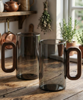 Tazze da caffè sottili in vetro grigio fumo con manico in legno
