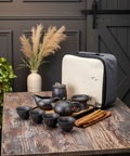 お茶の芸術に浸りましょう 絶妙な10ピースのヴィンテージ日本茶セット上品な黒の陶器で作られたこのセットには、穏やかなお茶のひとときを演出するために必要なものがすべて揃っています。竹製のサービングトレイと持ち運びに便利な収納バッグも付属しており、ご自宅での使用にも、外出先でのお茶会にも最適です。